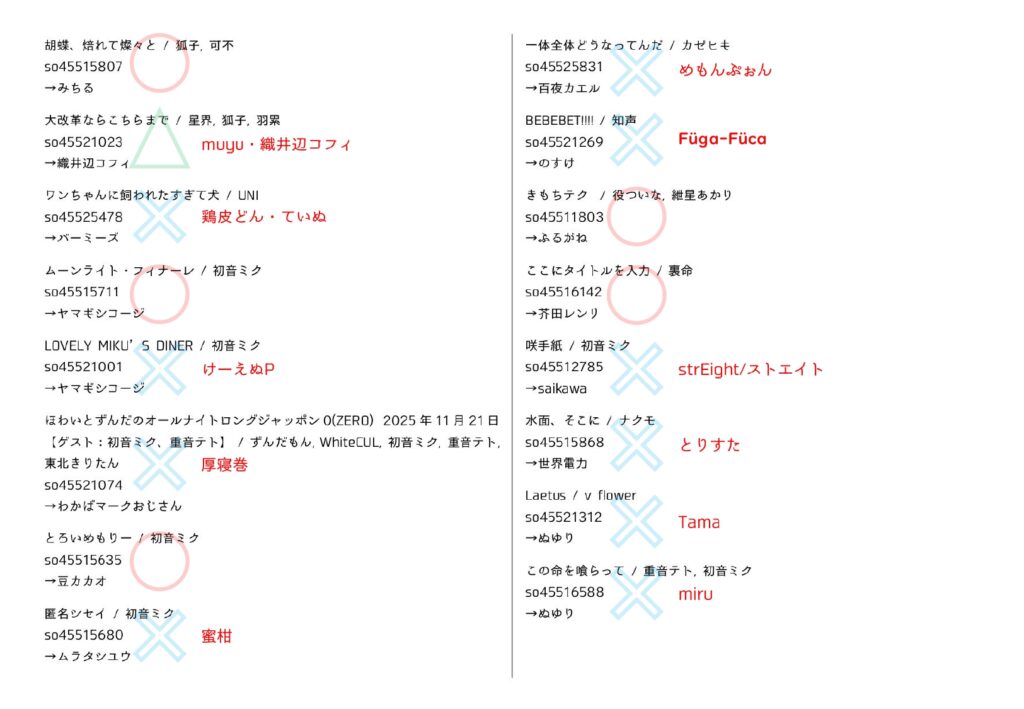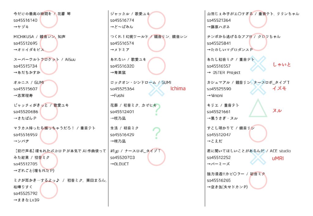 ◯は正解、✕は間違い、△は共作の一部など、?はネタバレシートにも本人のSNSなどからも発表がなく不明なものです。