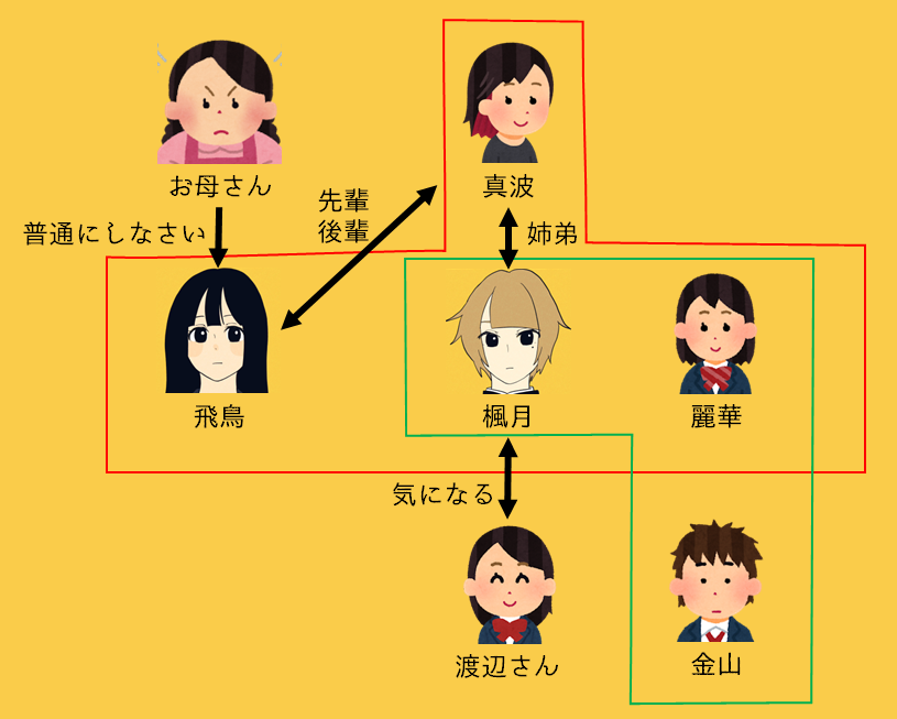 緑色の枠の3人で軽音楽部内のバンドを組んでいたのですが、作中で楓月が飛鳥を誘って赤色の枠の4人でバンドを組みます。